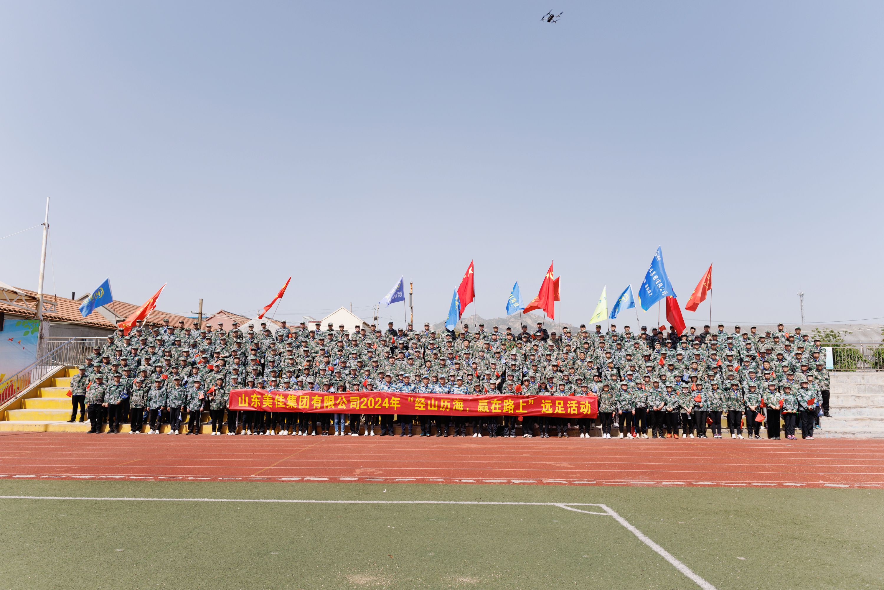 本次活动共有集团中心队、美加水产队、预制菜产业园队、日照佳苑队和青年团委好担当队五个方阵队列,共计317人参加。出发前,“佳”人们在厂区内集合,举行了出征仪式,集团董事长申照华向远足队伍进行了授旗,随着申董事长的出发指令,浩浩荡荡的队伍沐着晨光开始了17公里的远足征途。